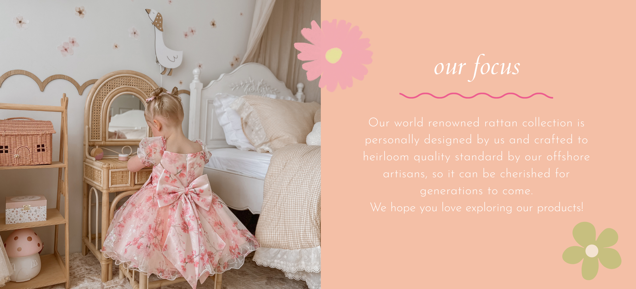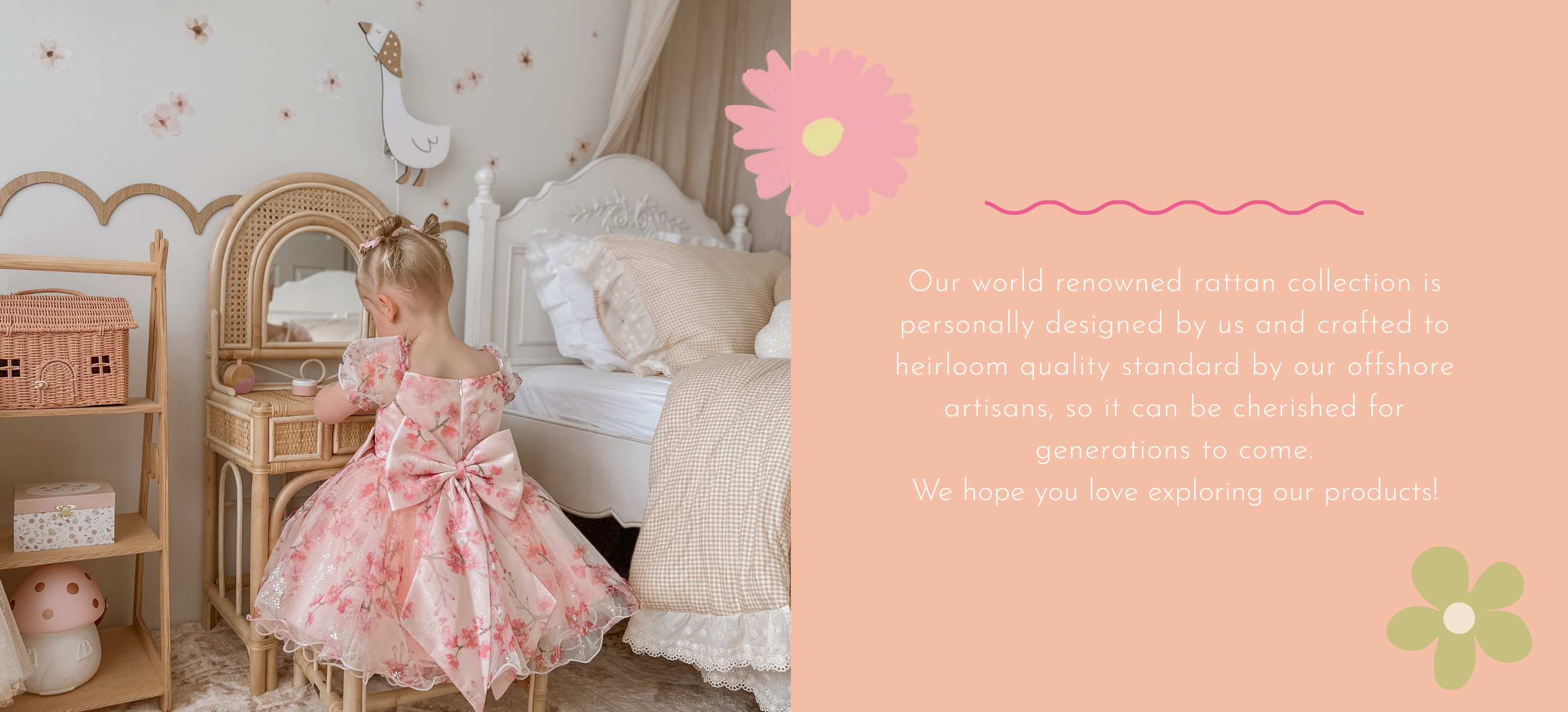 ** ALL OF OUR PIECES ARE THOUGHTFULLY AND LOVINGLY DESIGNED BY US HERE IN AUSTRALIA AND BROUGHT TO LIFE BY OUR WONDERFUL OFFSHORE ARTISANS BRINGING YOU THE BEST QUALITY CHILDREN'S RATTAN AND TIMBER TOYS AND FURNITURE TO LAST A LIFETIME WITH YOUR FAMILY AND THE NEXT **