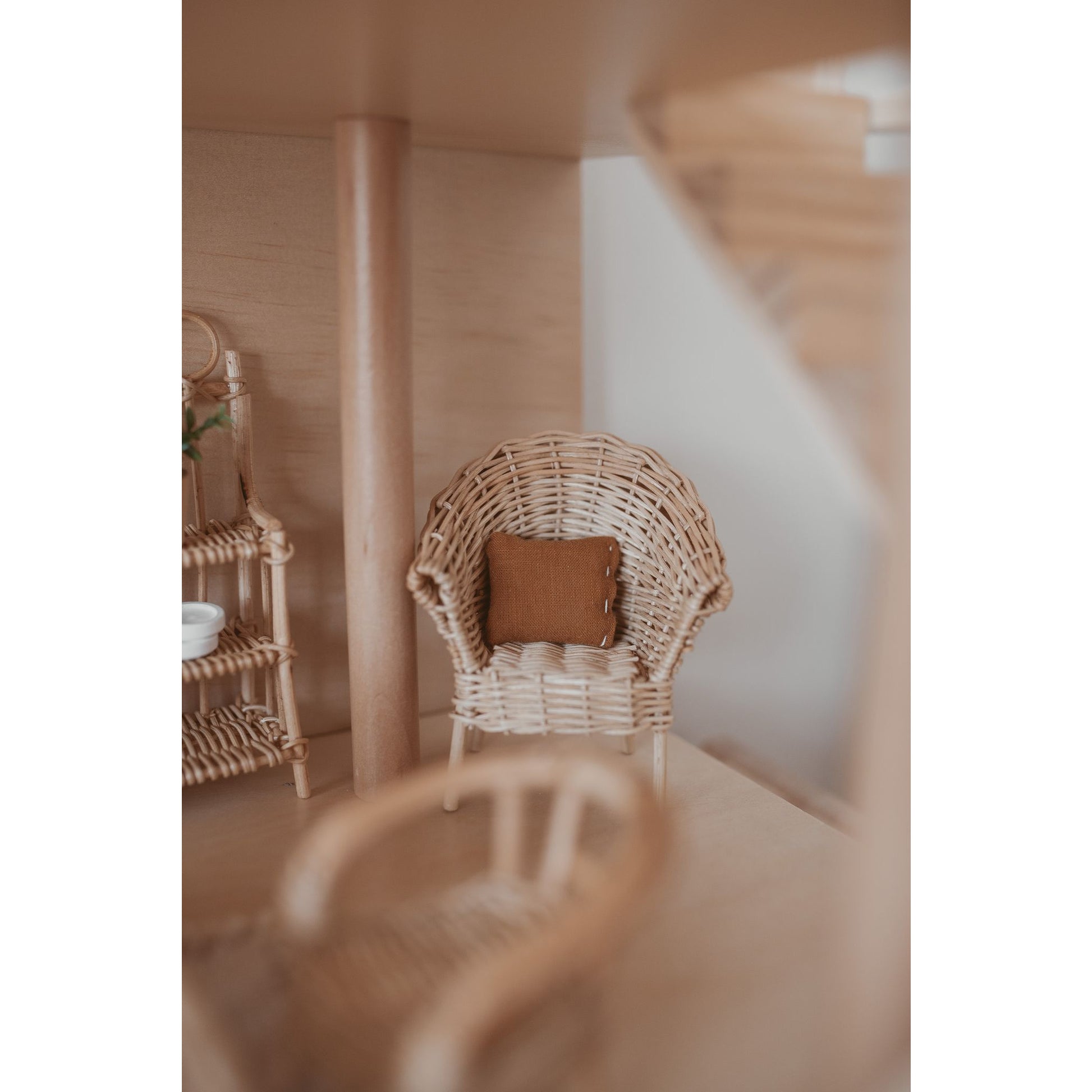 Our rattan doll house furniture is a must for any dollhouse. They are the perfect match for all of our dollhouses here at poppies. 14 Wicker/ Rattan pieces included