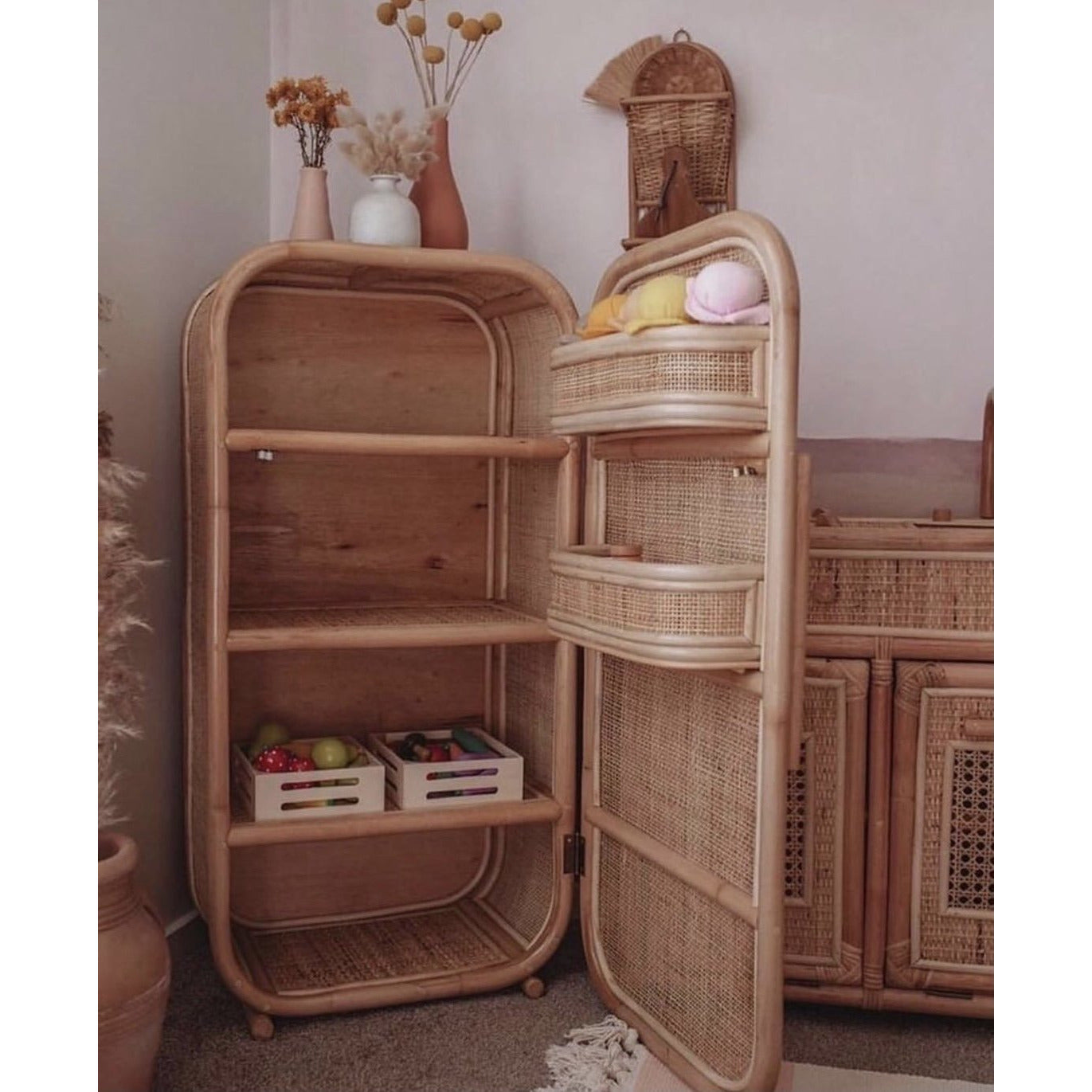 A must have addition for any toy room or cubby house our rattan fridge is perfect for role playing. Inside has 3 shelves and 2 shelves on the door.